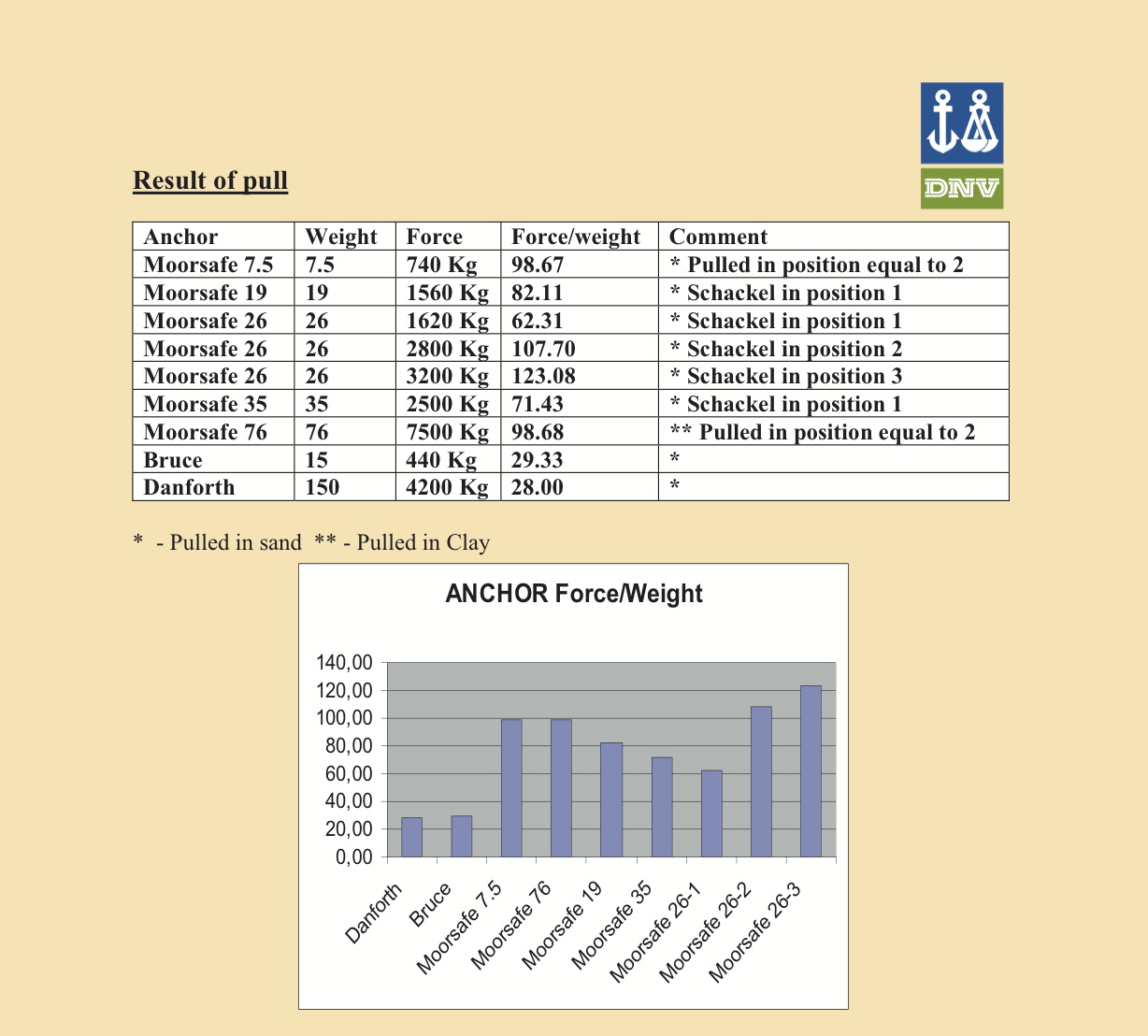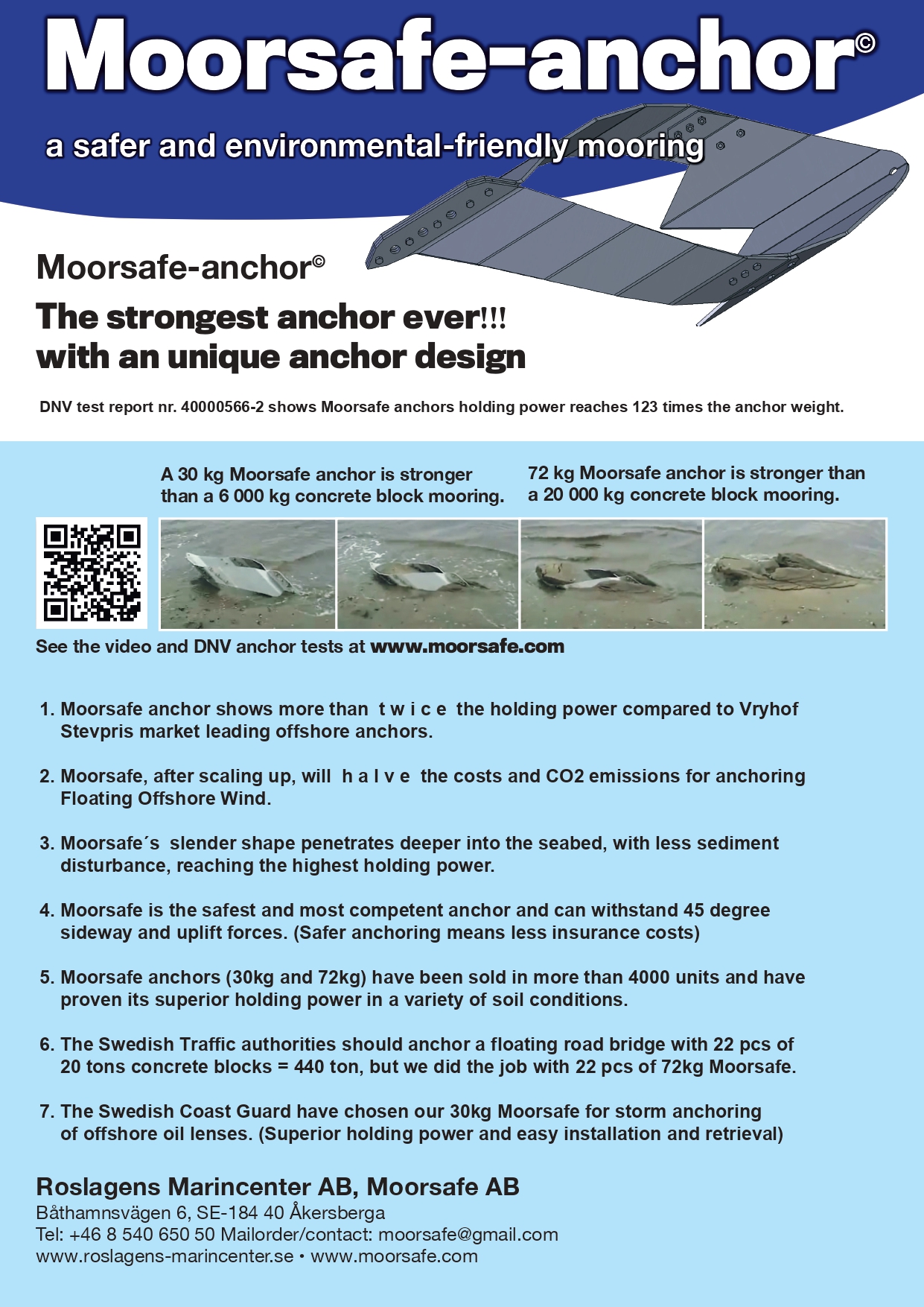 In 2008 we even invited the industry to participate and contribute in a program for comparative cost effective and reliable test of drag anchors, but we did not manage to get the sponsoring we needed for the project. Therefore we decided, for the time being, to concentrate on our already successful 30kg and 72kg Moorsafe anchors. As originator we have the sole copyright for the unique Moorsafe anchor design for many years to come, and through the years we have experienced the superior unparalleled holding power and we claim that Moorsafe is the most capable and strongest anchor concept ever.